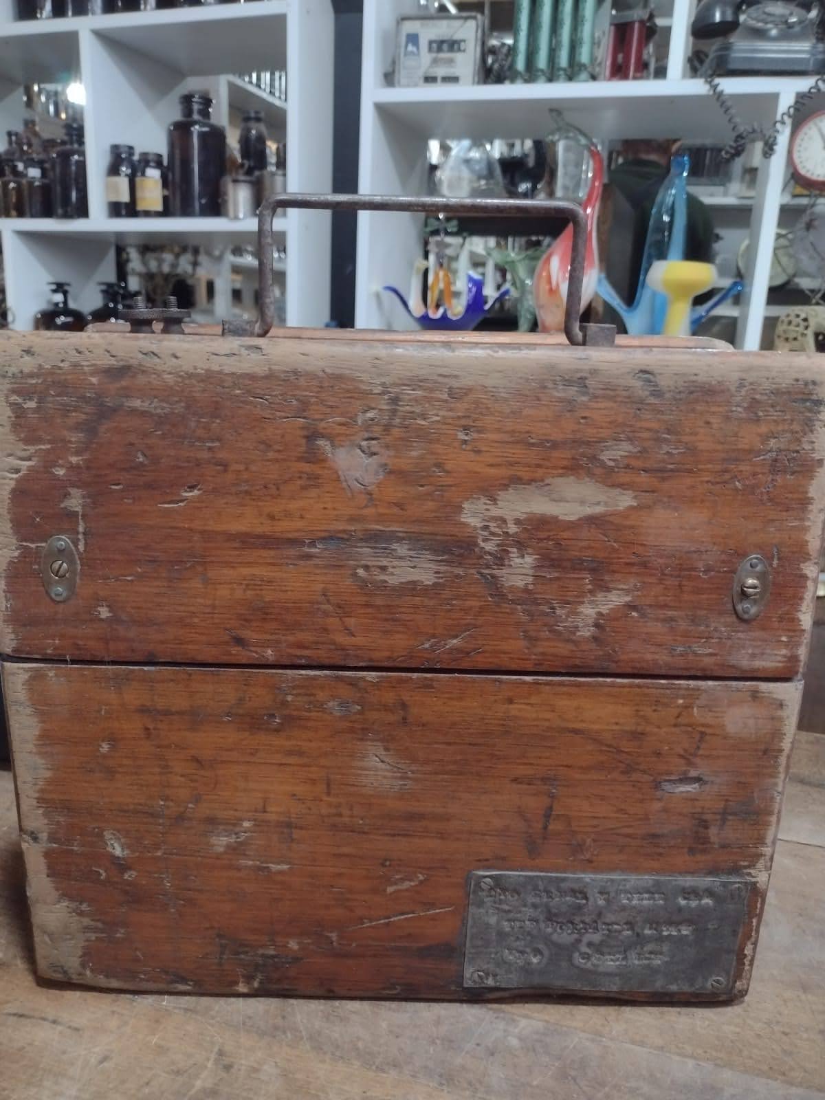 - Construcción en Madera: La caja es de madera maciza con un acabado rústico y desgastado que atestigua décadas de uso. Presenta la pátina, rasguños y marcas esperadas, lo que le otorga un carácter y autenticidad únicos.