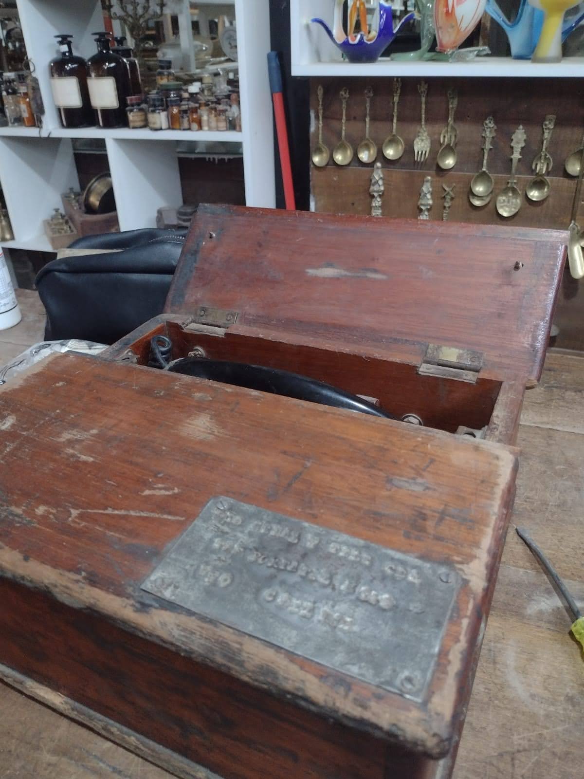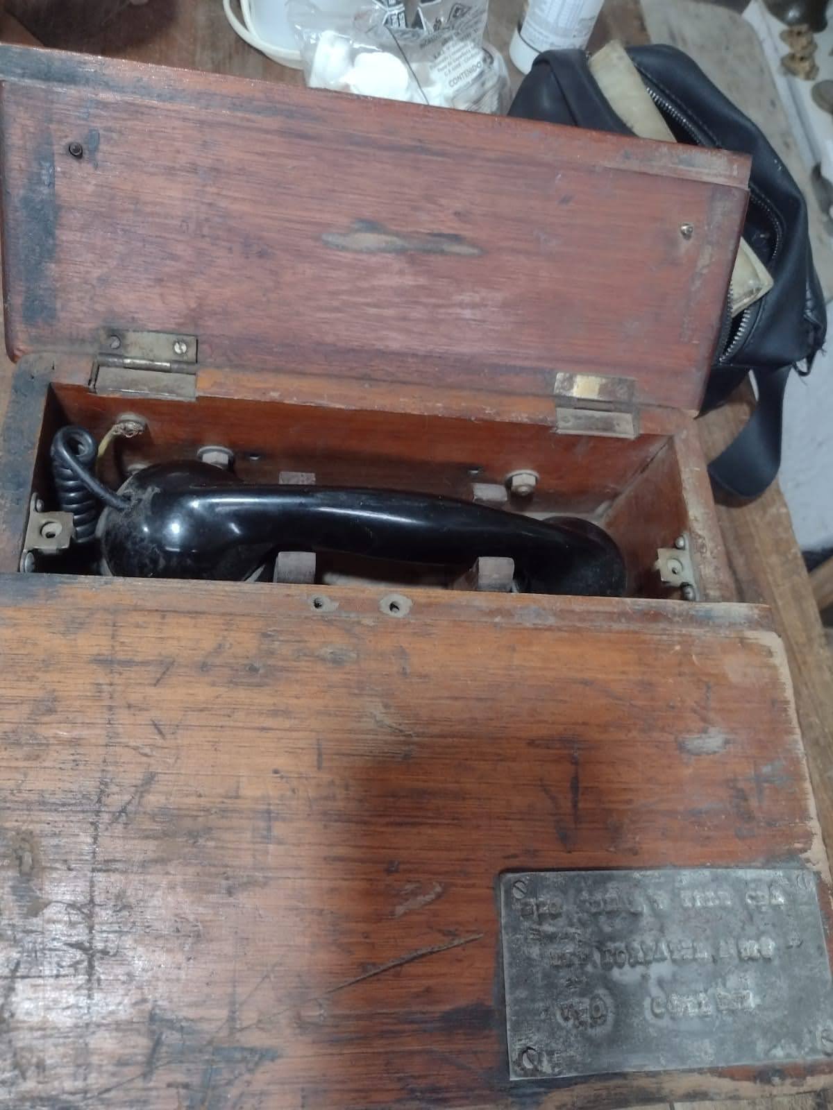 Una pieza de museo con un encanto inigualable. Este es un antiguo teléfono de campaña o de uso ferroviario/militar, encapsulado en su caja original de madera para transporte y protección.