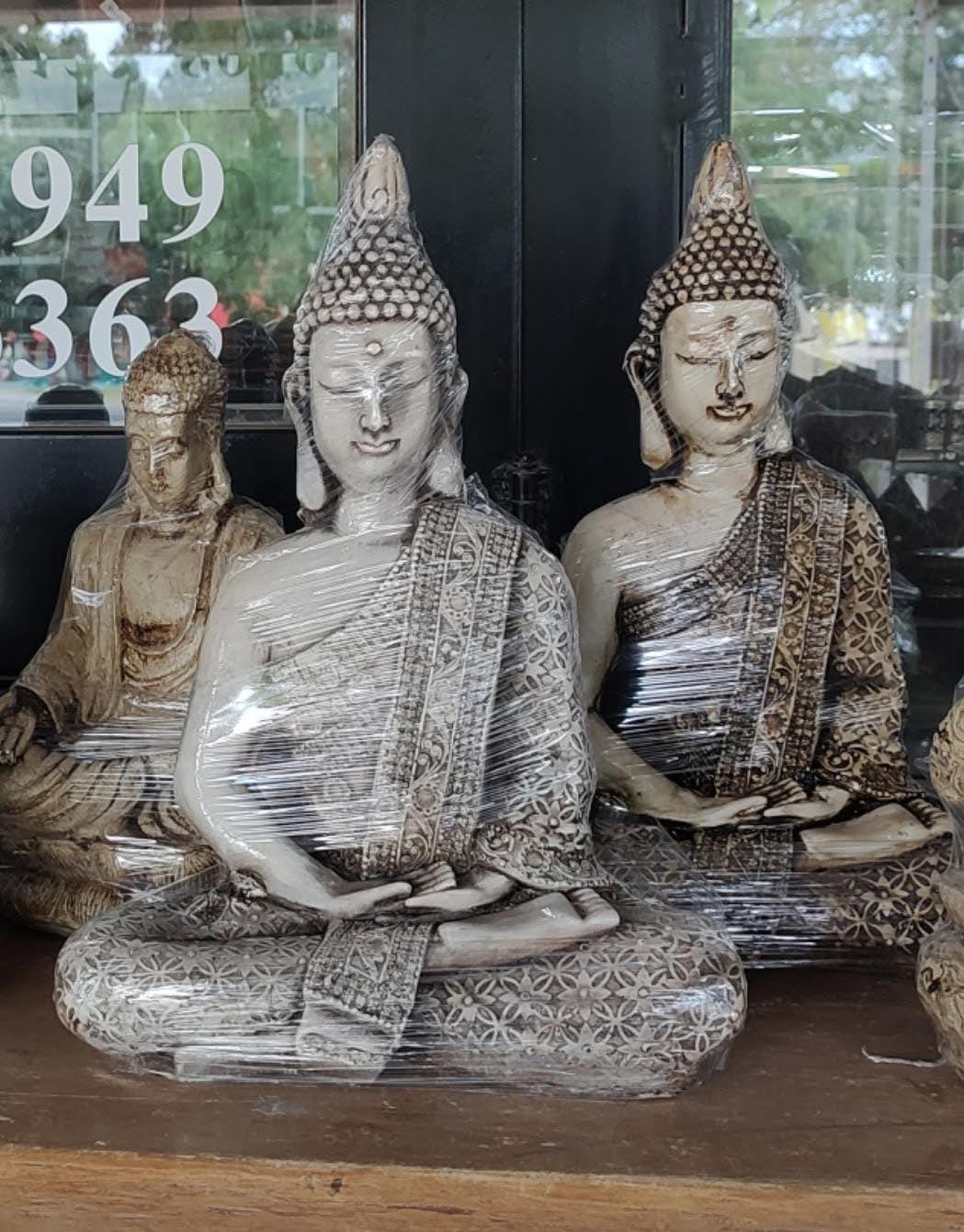 Estatuas de Buda Sentado: La mayoría de las figuras están representadas en la posición de meditación (Dhyana Mudra), con un diseño de vestimenta detallado que imita telas con patrones geométricos. El acabado jaspeado y los detalles en la vestimenta sugieren un estilo del sudeste asiático.