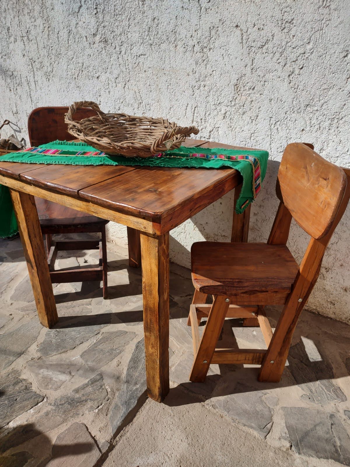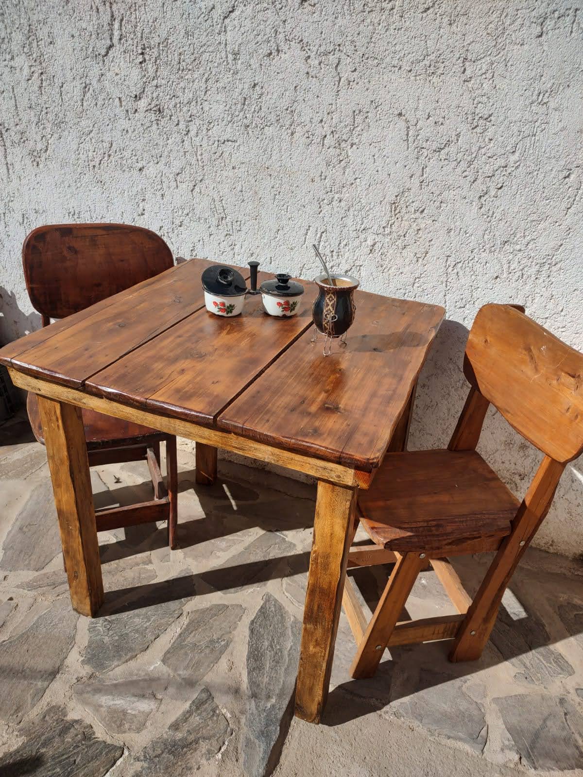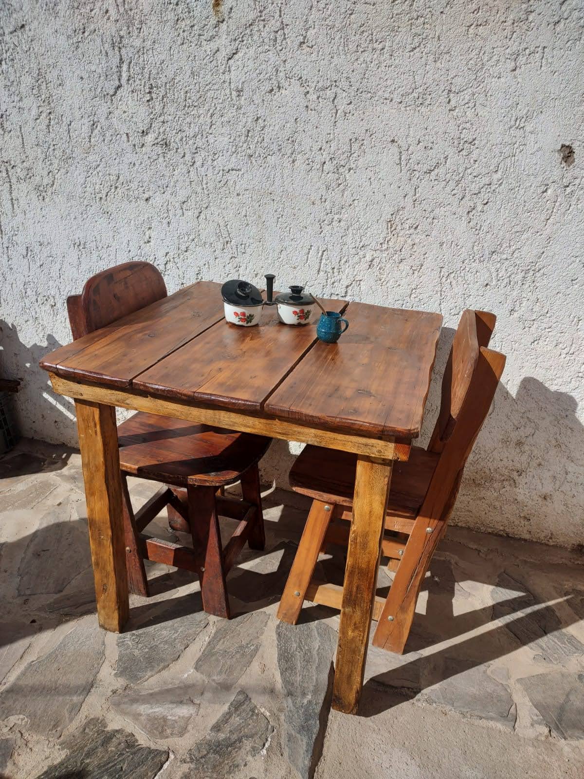 Conjunto de mesa y dos sillas de madera maciza, estilo rústico y artesanal. Ideal para cocina, galería o comedor de campo. Madera restaurada con acabado natural que resalta su veta y color. Sólido, estable y con mucho encanto vintage.