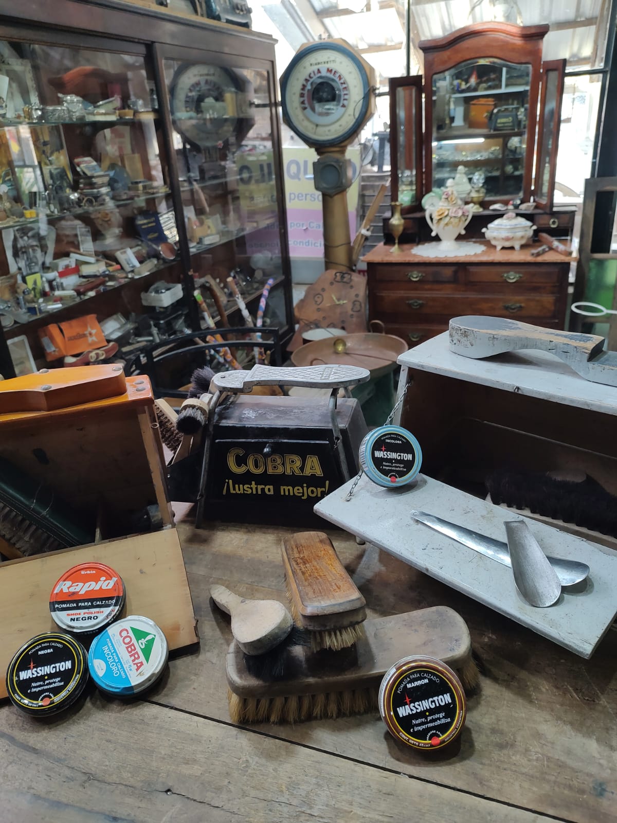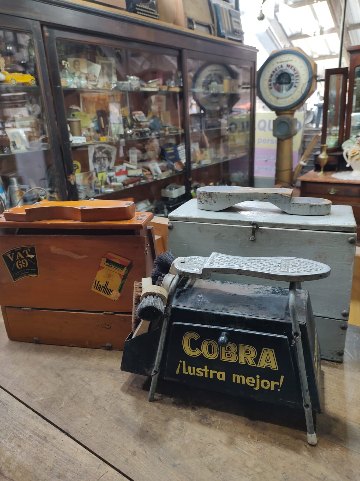 lustrabotas antiguo marca “Cobra ¡lustra mejor!”, pieza metálica con pedal y compartimentos para cepillos, en muy buen estado de conservación. Cajas de madera antiguas, una decorada con calcomanías de Marlboro y VAT 69, y otra en color gris claro con manijas superiores.